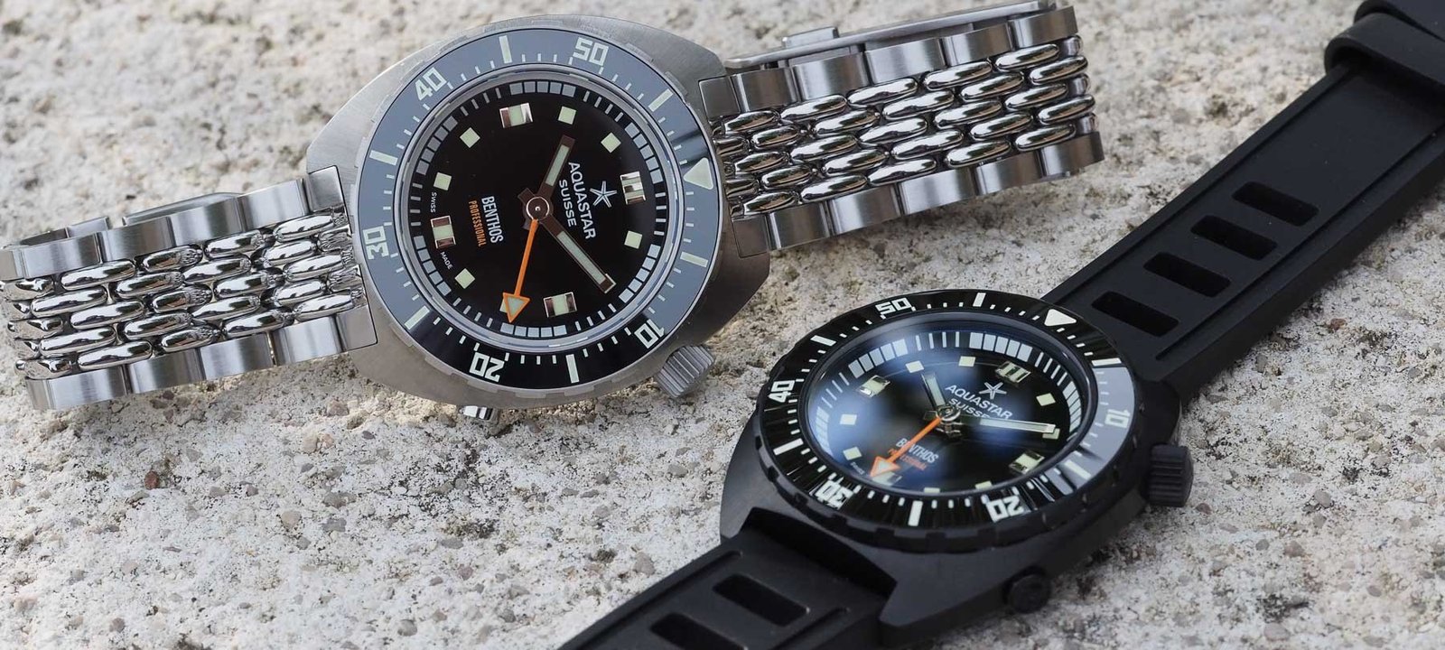 The most recent release came this January with the H2. Aquastar returned to a more affordable three-handed watch but added a screw-down helium valve at 4 o’clock. This 300m-rated diver had the look of a Benthos 500, but it featured a more compact 40mm by 44mm case.