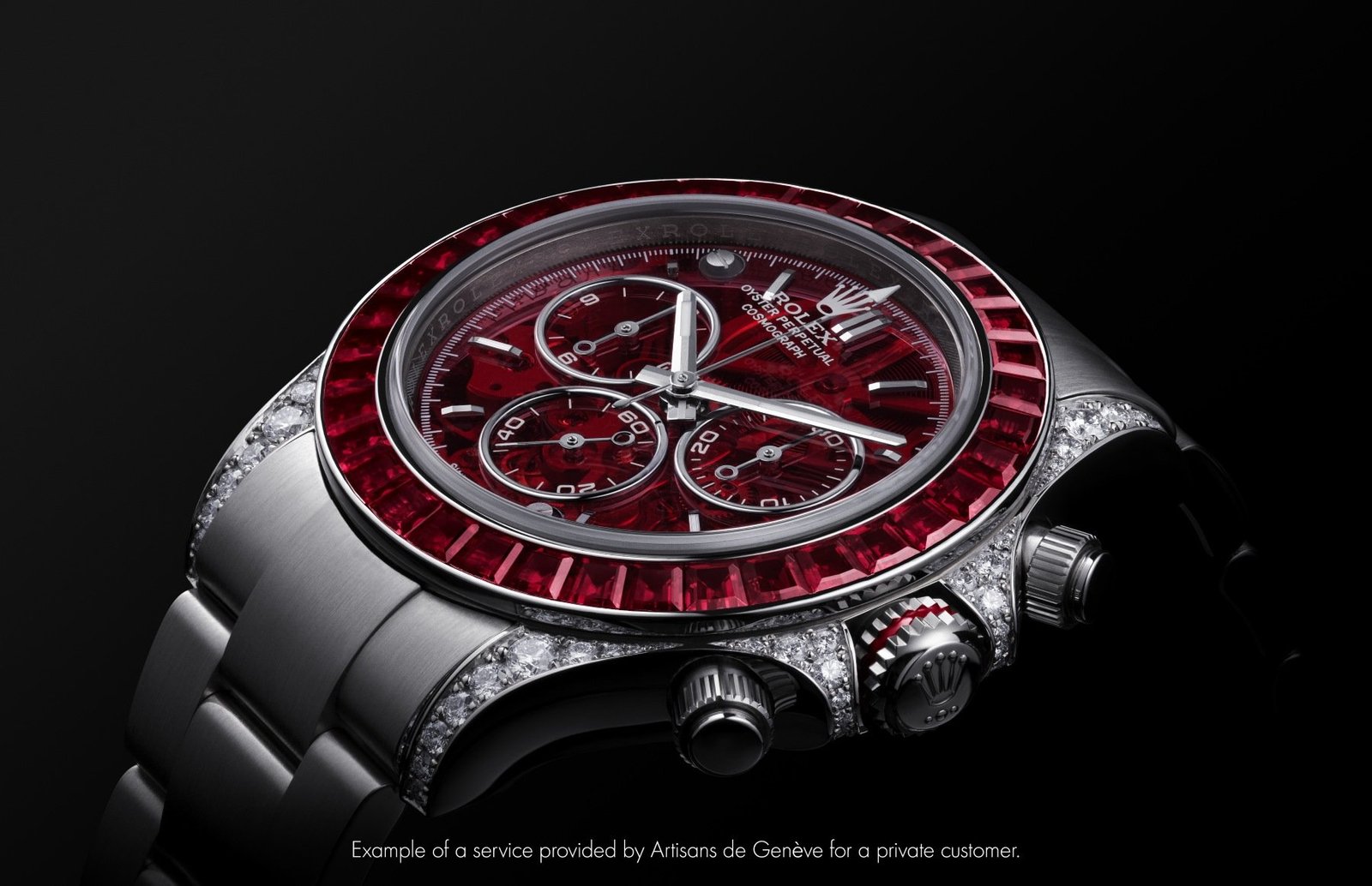 We know who walked into the Artisans de Genève workshop in the center of the watchmaking city, handed over the white gold Rolex Daytona ref. 116509 he’d purchased, and explained his vision for it to the Genevan “modders.” It was Mr. SJL — okay, we don’t know exactly who he is, but we do know that he works in hospitality. In his words, “I wanted a watch that reflected my passion for red, my signature color. I asked for the best, from stones and settings to the most complex techniques, without compromising on understated elegance.”
