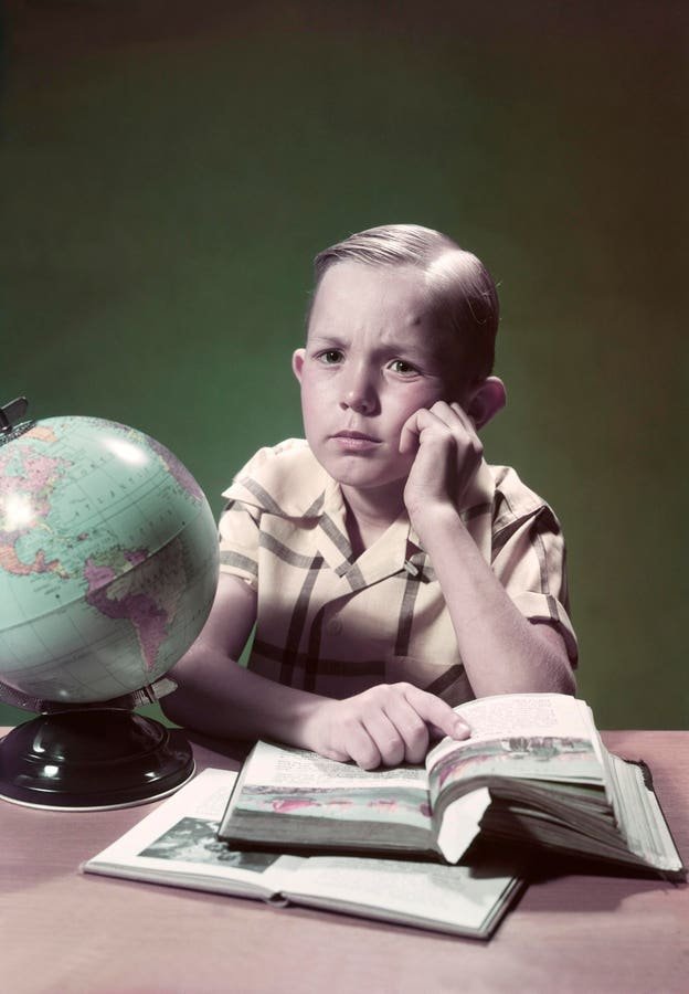 Young boy sitting at desk with globe and textbooks, 1950s. (Photo by Camerique/Getty Images)