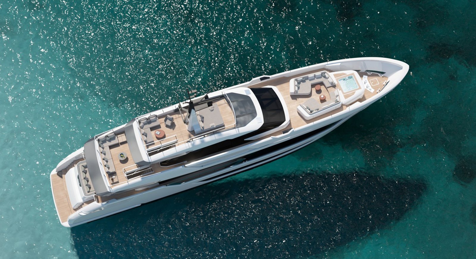 For instance, the transom on the other Saetta models is essentially vertical. Aboard the new superyacht model, it slopes down toward the water. Additionally, both the sundeck and the upper deck extend farther aft, shading some space beneath them. Similar to the transom, they curve downward, too.