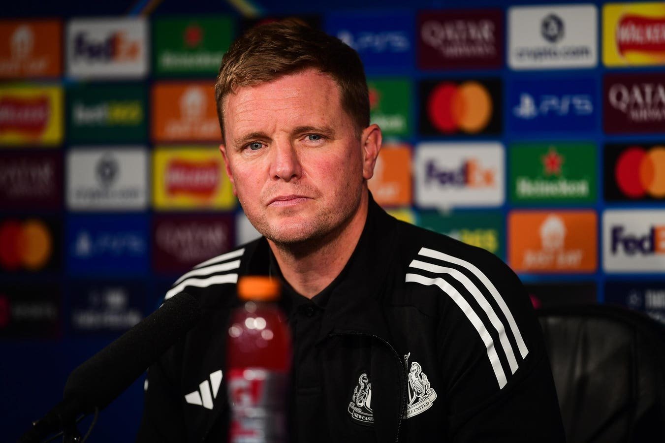 NEWCASTLE UPON TYNE, ENGLAND – SEPTEMBER 17: Newcastle United Head Coach Eddie Howe talks to the media ahead of their UEFA Champions League 2025/26 League Phase MD1 match against Barcelona at St James’ Park on September 17, 2025 in Newcastle upon Tyne, England. (Photo by Harriet Massey/ Newcastle United via Getty Images)