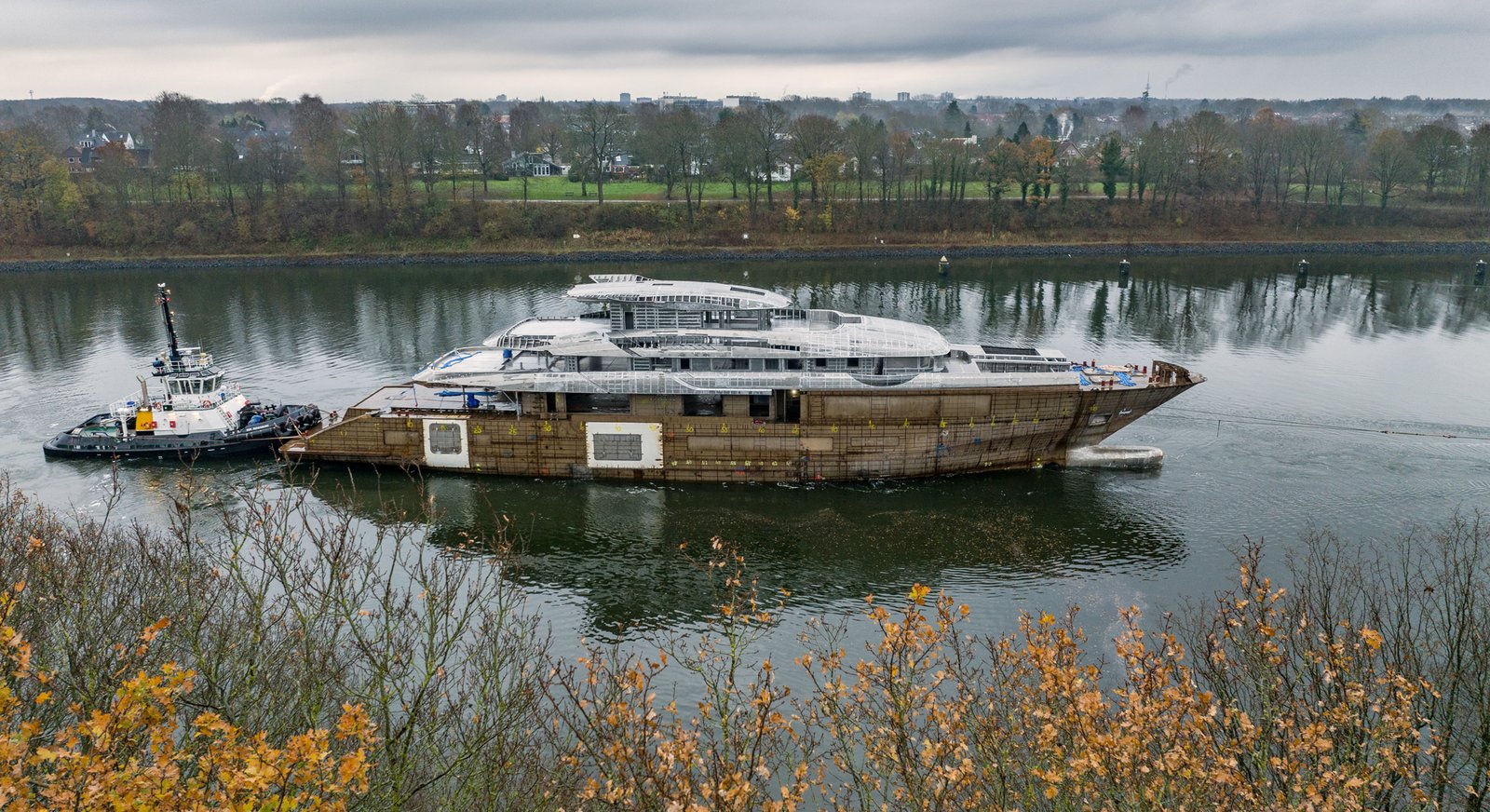 In fact, the photos capture her journey as tugs towed her from Poland, where construction began, to Germany. Abeking & Rasmussen relied on G+K SteelCon, which manufactures aluminum and steel components for a variety of ship- and yacht builders, to start the work. (On a related note, it’s common practice among several European shipyards to sub out hulls and/or superstructures.)