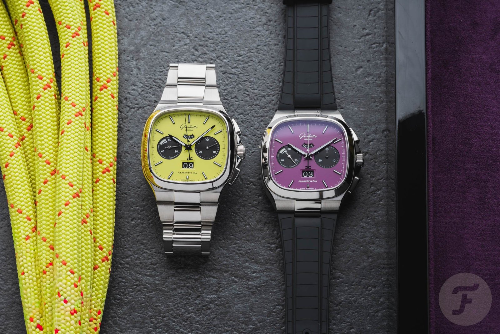 The Glashütte Original Seventies Chronograph Panorama Date is easily one of the most distinctive chronographs on the market. While it’s not a new watch, having debuted in 2014, it still manages to separate itself from a sea of lookalike luxury competitors. With its bold retro lines, the watch is a cool choice. For our hands-on review, we take a look at two new limited-edition versions in purple and lime green.