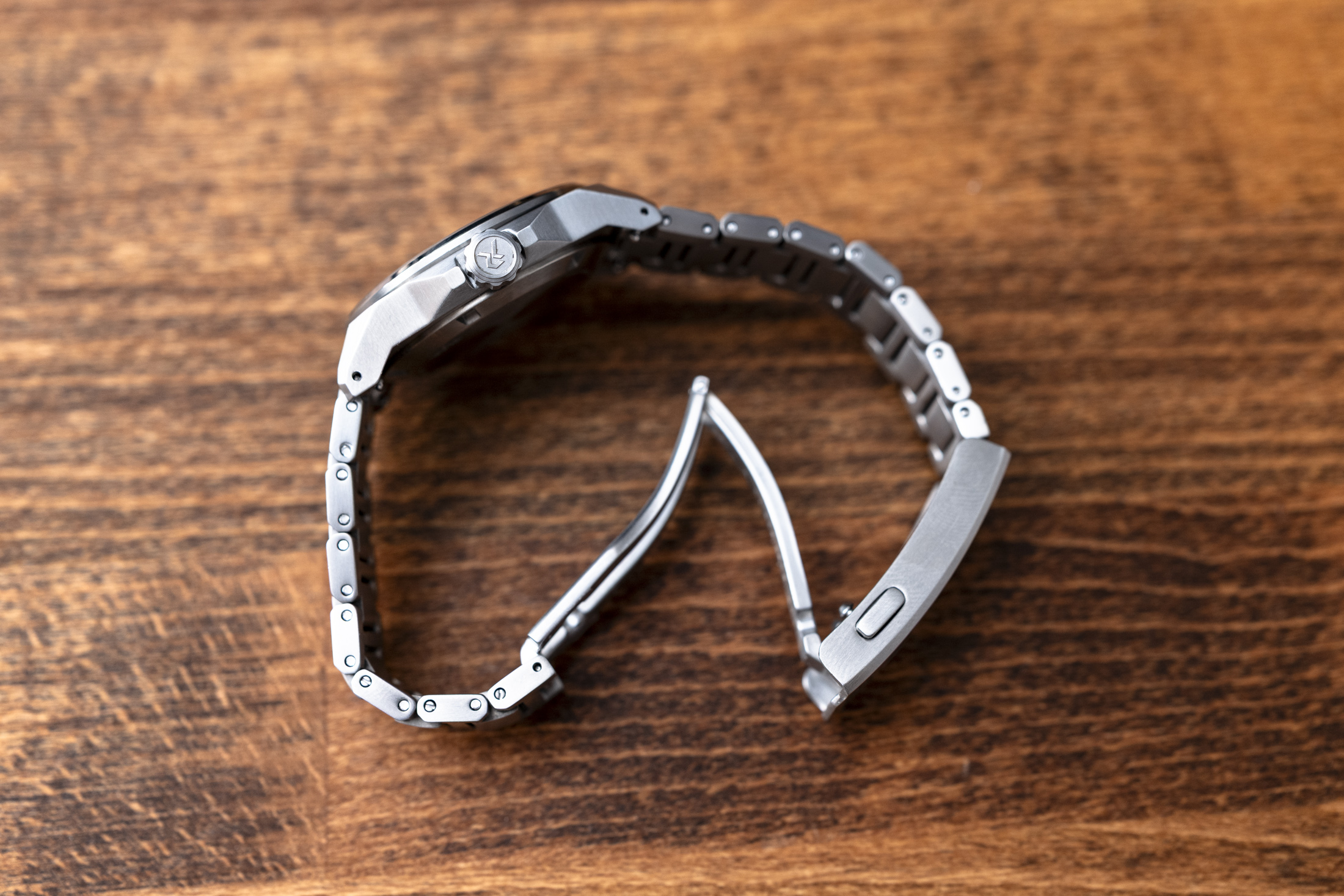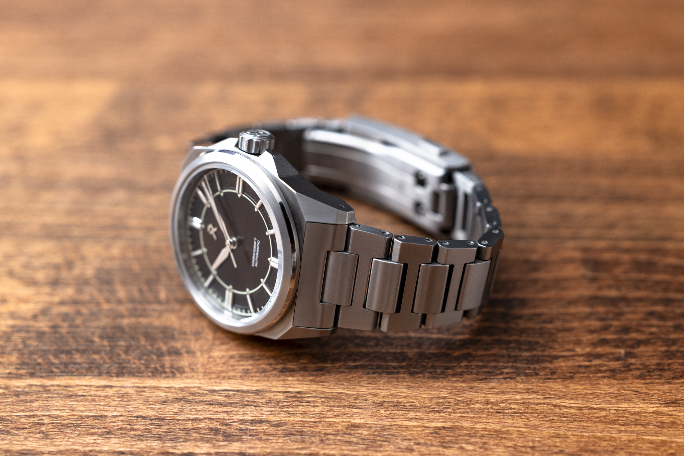 For the Resolute 36, that means a 36mm grade 2 titanium watch that is 9.5mm thick, has a lug-to-lug of 42.3mm, and has a surface coating called “UltraHex”, which has a hardness rating of ~1200 Hv (compared to a usual hardness of 110-150Hv for grade 2 titanium). The brushed case is matched by a brushed titanium bracelet with the same hardness treatment. Total weight on the bracelet is around 90 grams (36mm for the case only), and you get 100 meters of water resistance, a screw down crown, a flat sapphire crystal with inside AR, a screwed case back, and a lug width of 20mm.