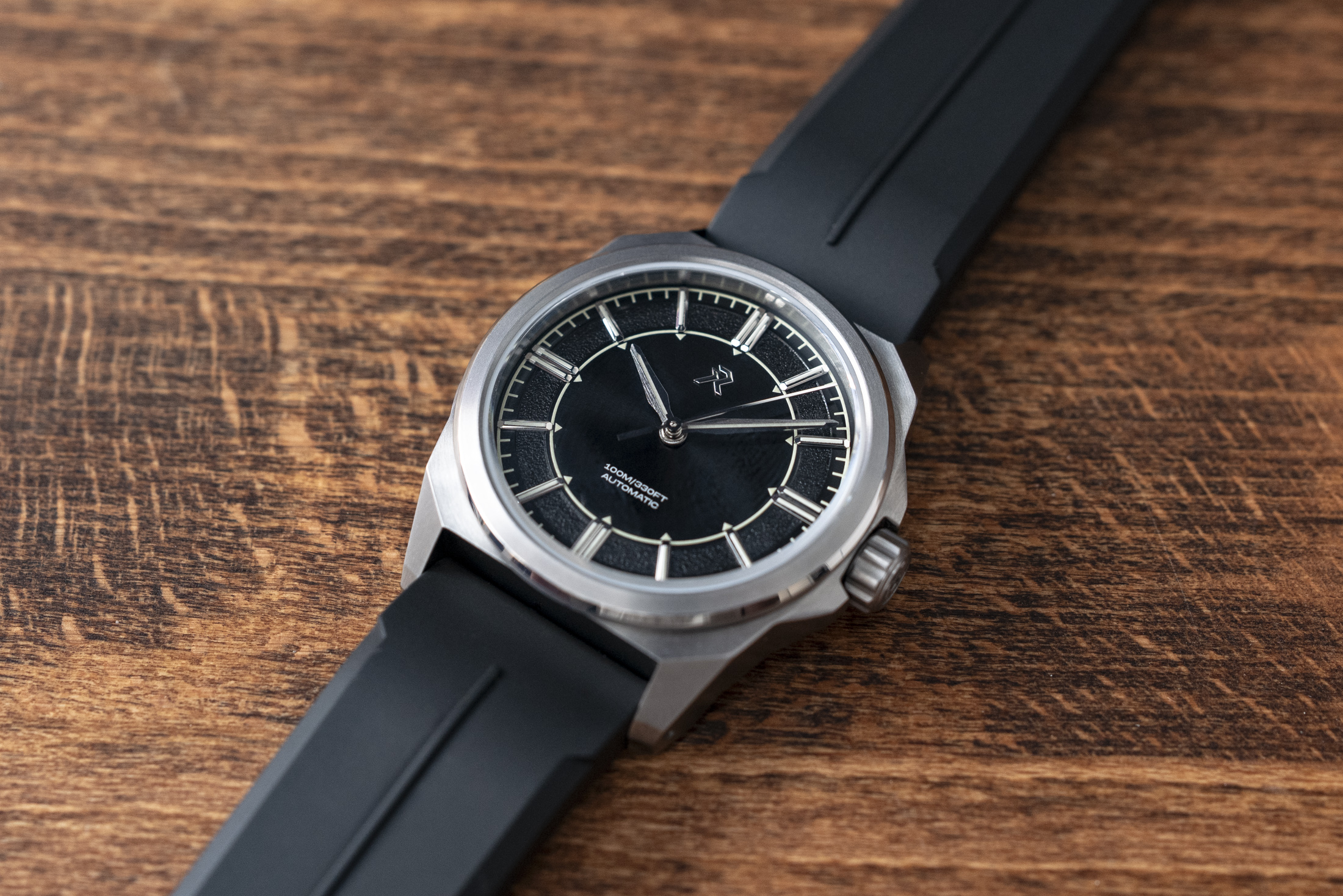 Actually, I’d go as far as to say its on-wrist experience is quite uncommon, at least, at first. Not at all bad (for my wrist, quite good), but the thin and not especially large case is matched with quite wide lugs (20mm spacing on a 36mm case), so the watch has absolutely no weight shift or wobble on your wrist. It’s balanced, lightweight, and very comfortable. Furthermore, if you fit it to the brand’s rubber strap, it almost looks like a small Bell & Ross, with the black rubber commanding much of the presence and the lion’s share of how the Resolute 36 sits on your wrist. The rubber option is molded to a soft curve at the lugs and is finished with a matching titanium buckle.