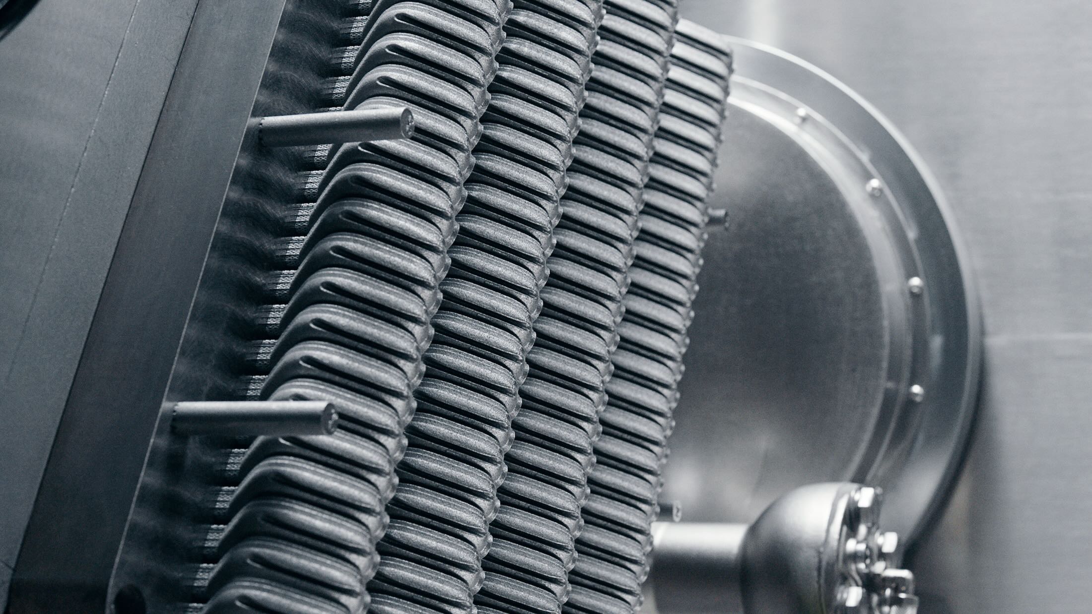 The finished prints rise from the bed of titanium powder in this step, where the loose powder is also vacuumed away to reclaim for future prints.