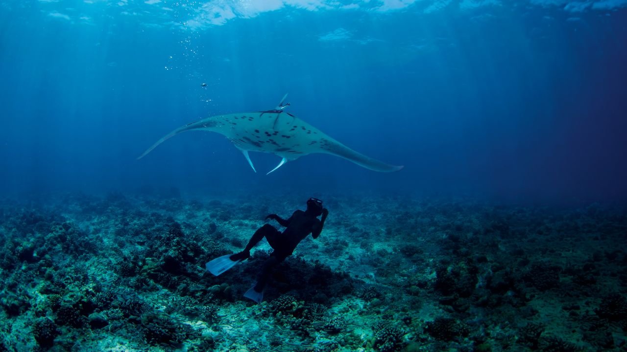 I was staying at Finolhu, A Seaside Collection Resort, a serene 125-villa property on one of the 75 islands that make up Baa Atoll. Ivanna Tobar, the resort’s on-staff marine biologist (many properties in the archipelago have them), gave us the lowdown as we approached the bay: “No boats are allowed inside, so we have to swim in. We get 45 minutes, then we have to come out.” Biosphere rangers would be in the water to ensure we didn’t misbehave. “No chasing, no touching, and absolutely no riding the mantas. This is a serious offense, okay?”