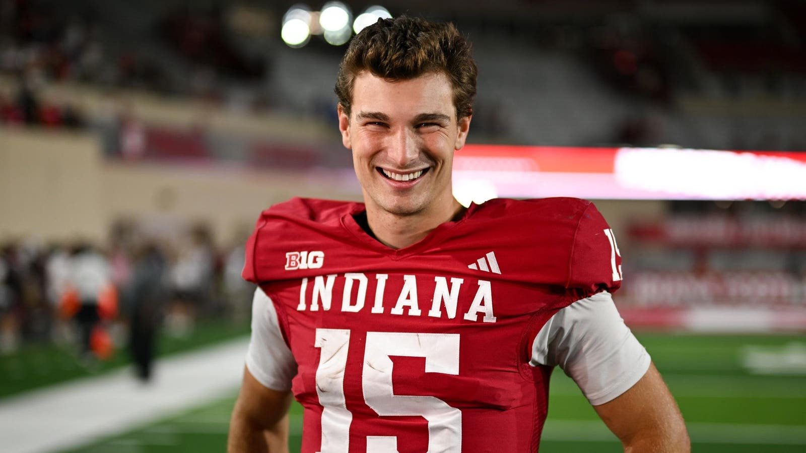 BLOOMINGTON, Ind. – Indiana Hoosiers QB Fernando Mendoza is all smiles following a win against the Indiana State Sycamores on September 12, 2025 at Memorial Stadium. (Photo by James Black/Icon Sportswire via Getty Images)