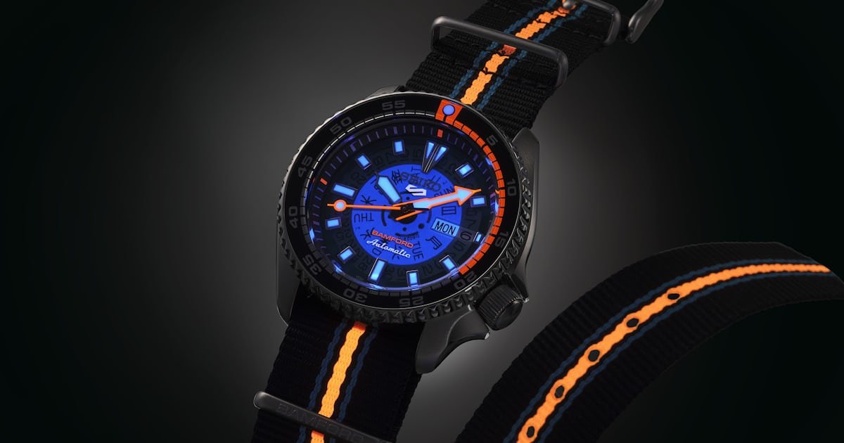 Inside the case is the automatic Calibre 4R36 with 41 hours of power reserve, with hours, minutes, hack seconds, day, and date. But the real fun comes from the use of lume. The LumiBrite indices and hands aren’t the only glow-in-the-dark features. The day disc glows as well, and shows through the dial, but today’s day will still stand out a bit brighter, being unobstructed via the cutout window. The nylon NATO strap in black and blue has a bright, luminous orange stripe down the middle as well, which is a fun trick.