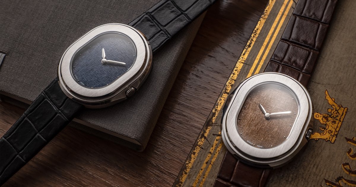 These new iterations are essentially just new dials, so the Linen Parade models offer the same physical form as the preceding launch models, measuring 35 mm × 41 mm × 8.2 mm and featuring a lug-less stainless-steel “stadium” case shape. Despite its slim profile, the 1174 offers 100m of water resistance, achieved thanks to a design in which screws pass through the entire case and connect to the underside of the bezel. The bezel and vertically brushed, and both of the dials (brown for Tobacco and blue for Slate) are largely text-free and set with tiny cylindrical hour markers.