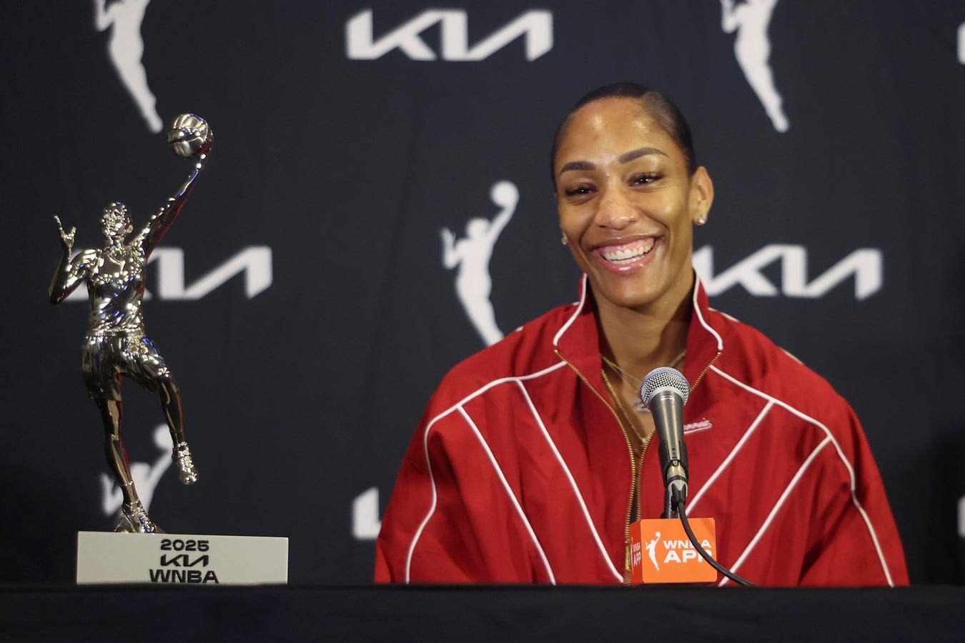 LAS VEGAS, NEVADA – SEPTEMBER 21: A’ja Wilson #22 of the Las Vegas Aces smiles during a news conference after receiving the 2025 WNBA MVP award before Game One of the 2025 WNBA Playoffs semifinals between the Aces and the Indiana Fever at Michelob ULTRA Arena on September 21, 2025 in Las Vegas, Nevada. NOTE TO USER: User expressly acknowledges and agrees that, by downloading and or using this photograph, User is consenting to the terms and conditions of the Getty Images License Agreement. (Photo by Ian Maule/Getty Images)