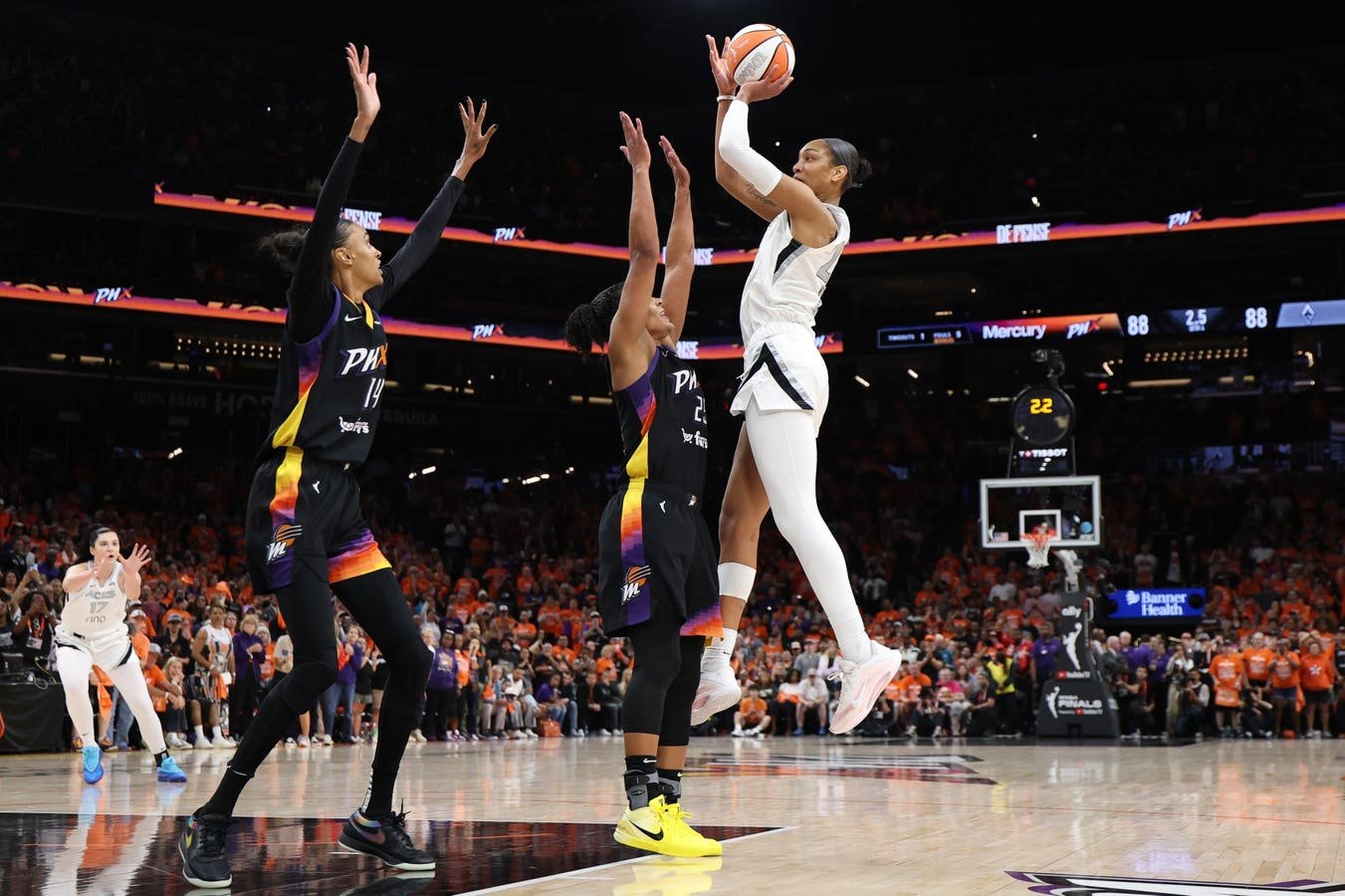 PHOENIX, ARIZONA – OCTOBER 08: A’ja Wilson #22 of the Las Vegas Aces makes the go ahead basket against the Phoenix Mercury with less than one second left in the fourth quarter of Game Three of the 2025 WNBA Playoffs finals at Mortgage Matchup Center on October 08, 2025 in Phoenix, Arizona. NOTE TO USER: User expressly acknowledges and agrees that, by downloading and or using this photograph, User is consenting to the terms and conditions of the Getty Images License Agreement. (Photo by Christian Petersen/Getty Images)