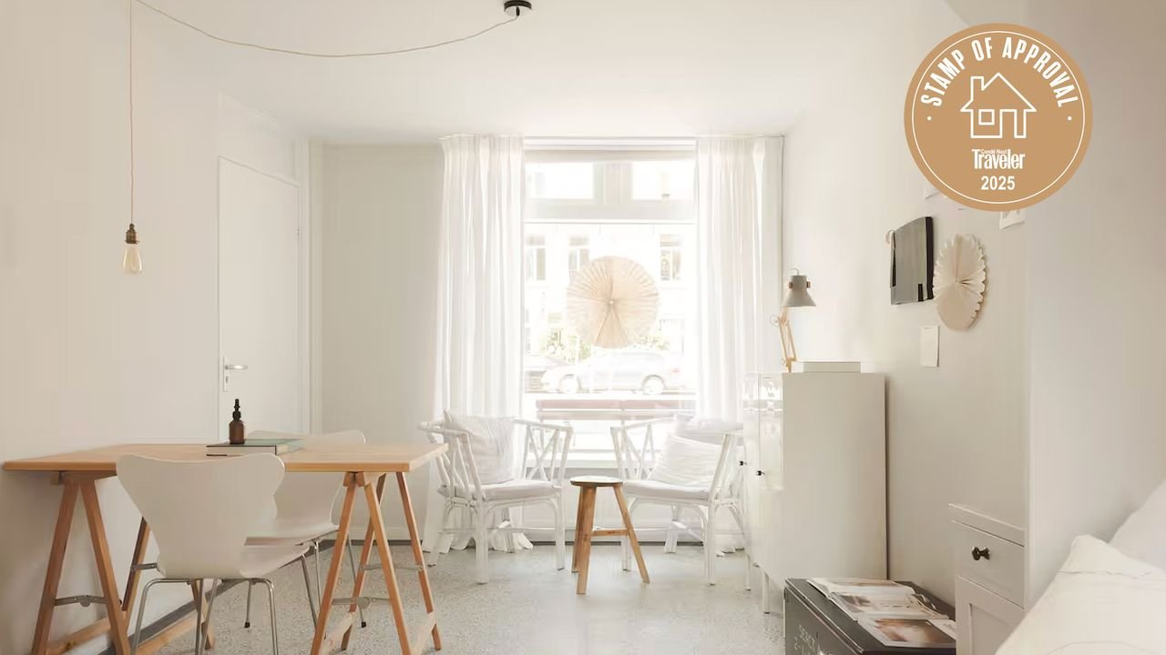 To the left of the seating nook is a small, light wooden dining table. It was here that we found our welcome gifts: a bottle of wine, savory crackers, and a mini tray of thoughtfully chosen business cards—local restaurants, bakeries, art galleries, all handpicked by Jantine. A cheese knife, small cutting board, and utensils sat ready on the table, along with a curated Amsterdam guidebook from atelier Sukha, filled with neighborhood finds. Subtle hints of tasteful design complete the studio: A simple, chic light bulb fixture suspends from a secure cord above the table. Scandi-style prints hang throughout.