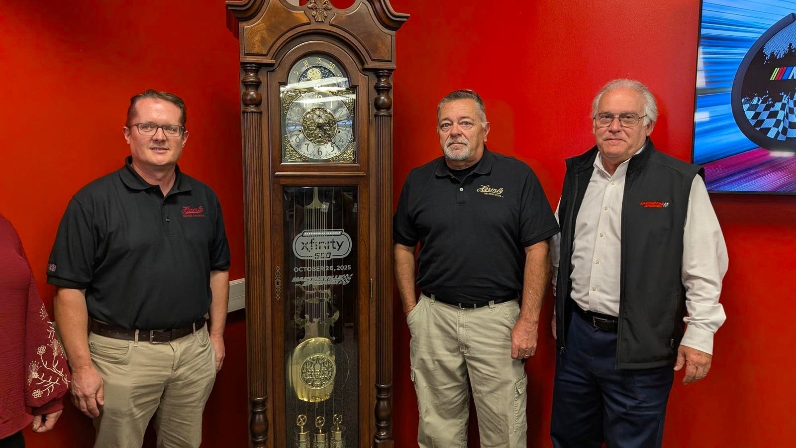Chad Eby, President of Hermle NA and 1922 Commercial Furniture Co., Jeff Painter, vice president of 1922 Commercial Furniture Co., and Clay Campbell Martinsville Speedway president show off the new grandfather clock from Hermle that will be awared to winning drivers starting in 2026, Friday at Martinsville Speedway.