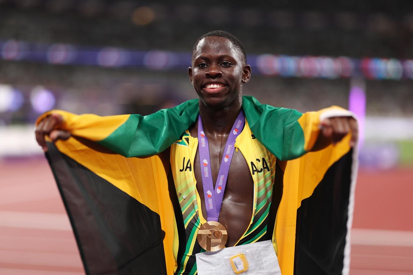 TOKYO, JAPAN – SEPTEMBER 14: Gold medalist Oblique Seville of Team Jamaica celebrates with the national flag of Jamaica after competing in the Men’s 100 Metres Final on day two of the World Athletics Championships Tokyo 2025 at National Stadium on September 14, 2025 in Tokyo, Japan. (Photo by Emilee Chinn/Getty Images)