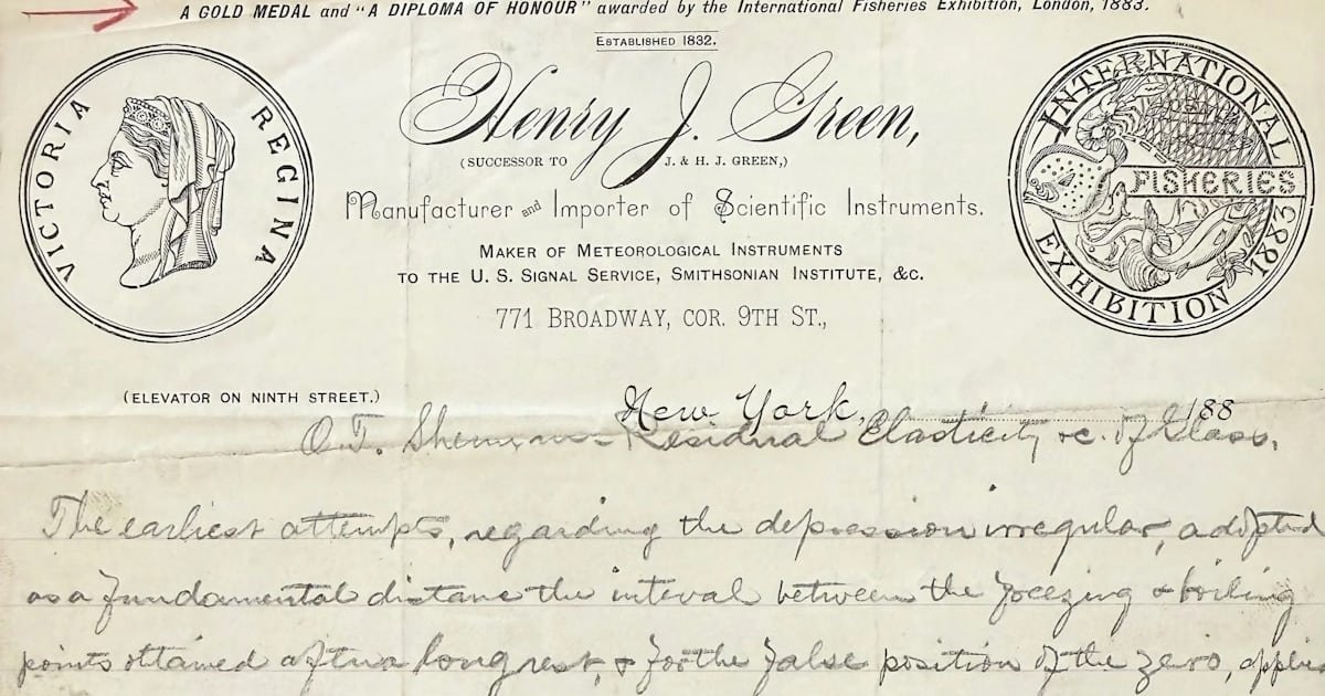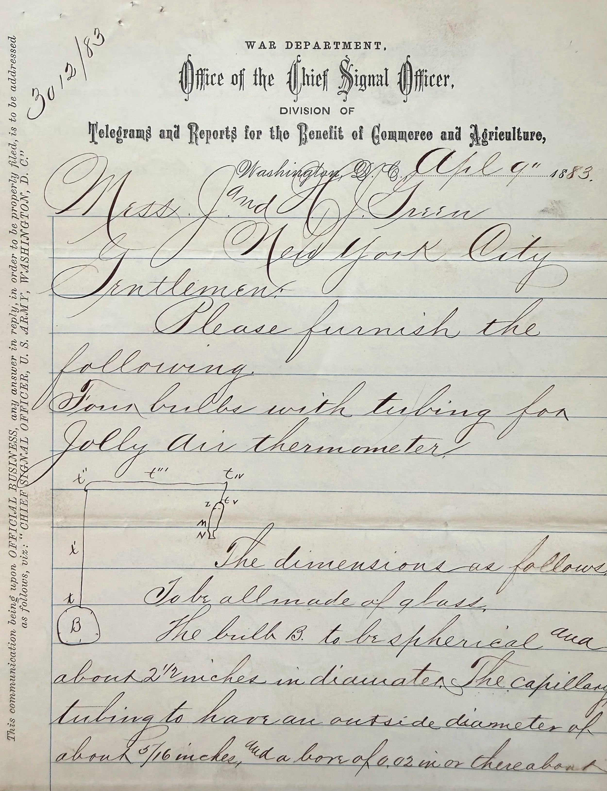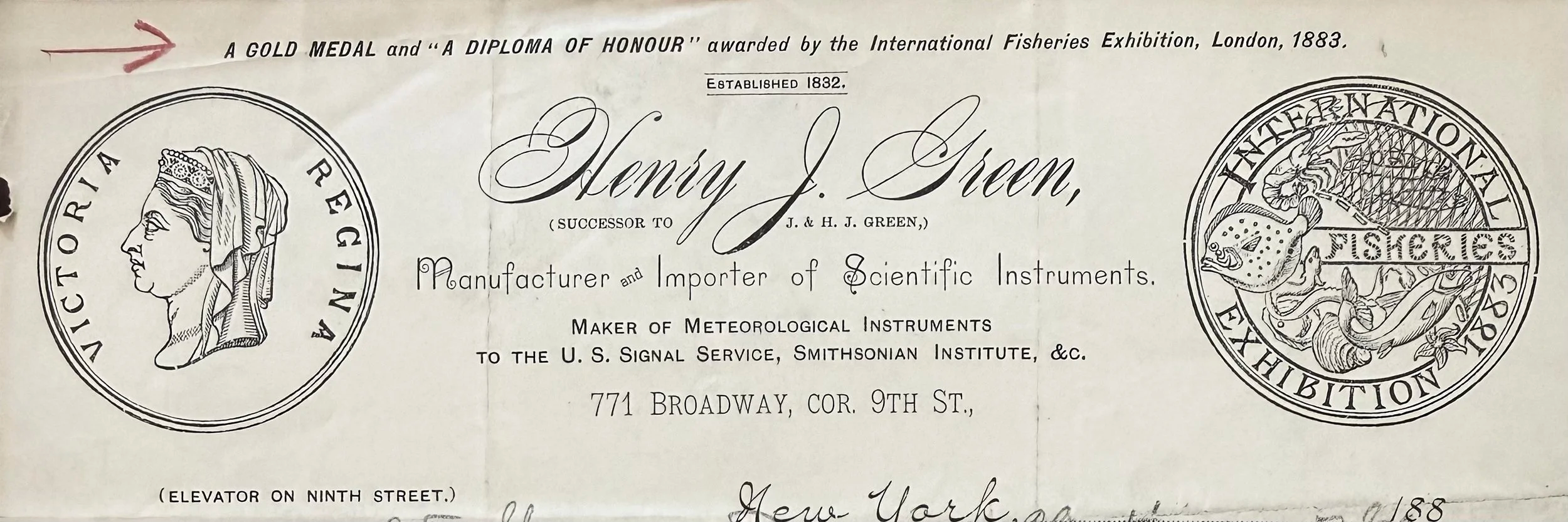 In 1883, the Chief Signal Officer requested some custom glass bulbs and glass tubing for a type of thermometer called a Jolly air thermometer (it’s not particularly cheerful; just named after someone called Jolly). He included a sketch of what he wanted, with dimensions (Image 4). A later letter from Green shows a particularly elaborate Gilded Age letterhead, bearing an image of a medal that Green received at the International Fisheries Exhibition, a kind of World’s Fair in London in 1883 (Image 5).