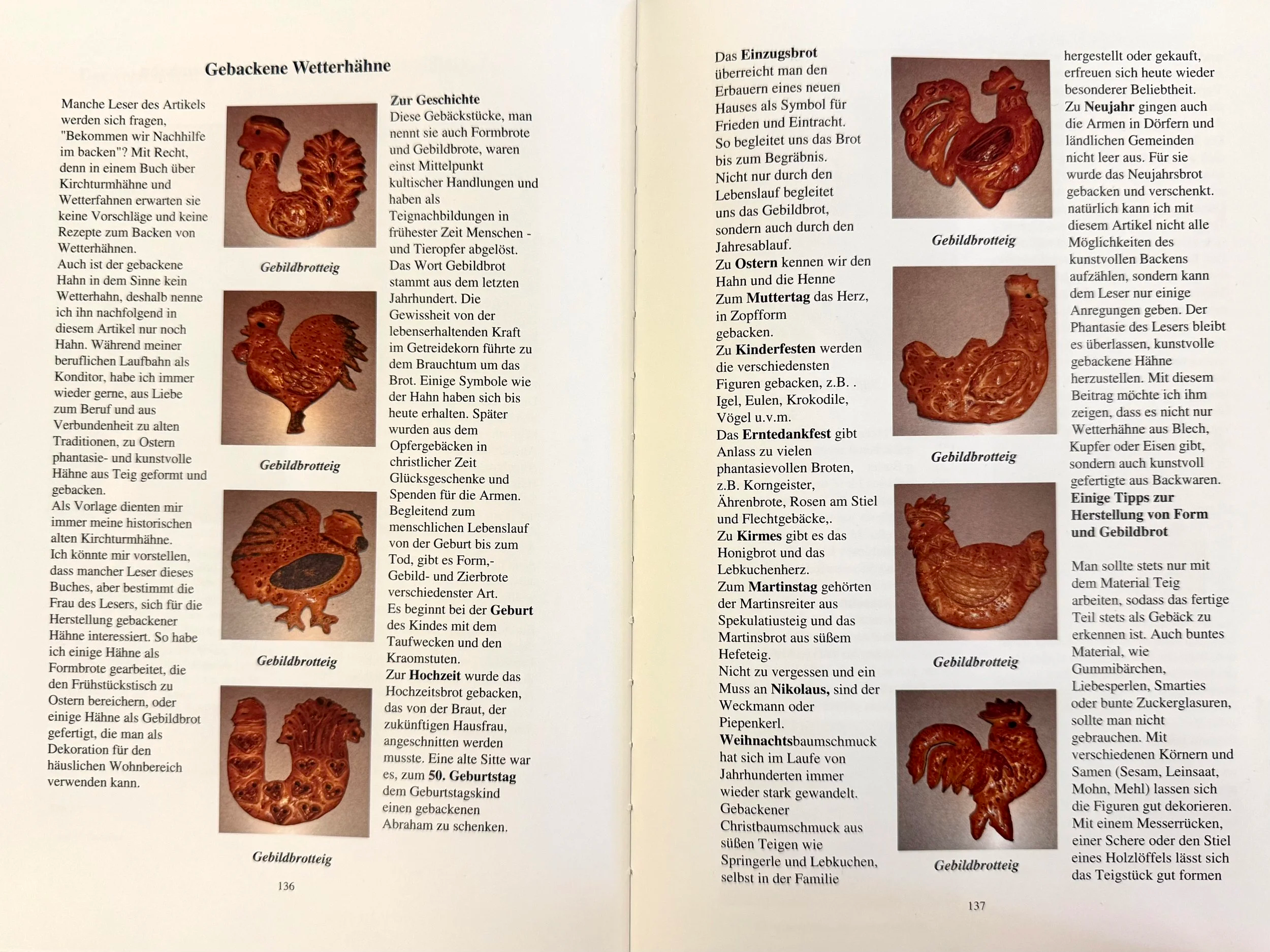 Ina Schröer goes on to discuss the Christian symbolism of roosters and why they appear on top of churches. Although the book is exhaustive, there isn’t a huge amount of variation among the vanes. There are a lot of roosters and crosses, with a smattering of other religious figures, like the archangel Michael battling Satan (image 9). I was surprised to discover, however, that the author included his own accomplished creations in another area: baking bread in the shape of weather vanes (image 10).