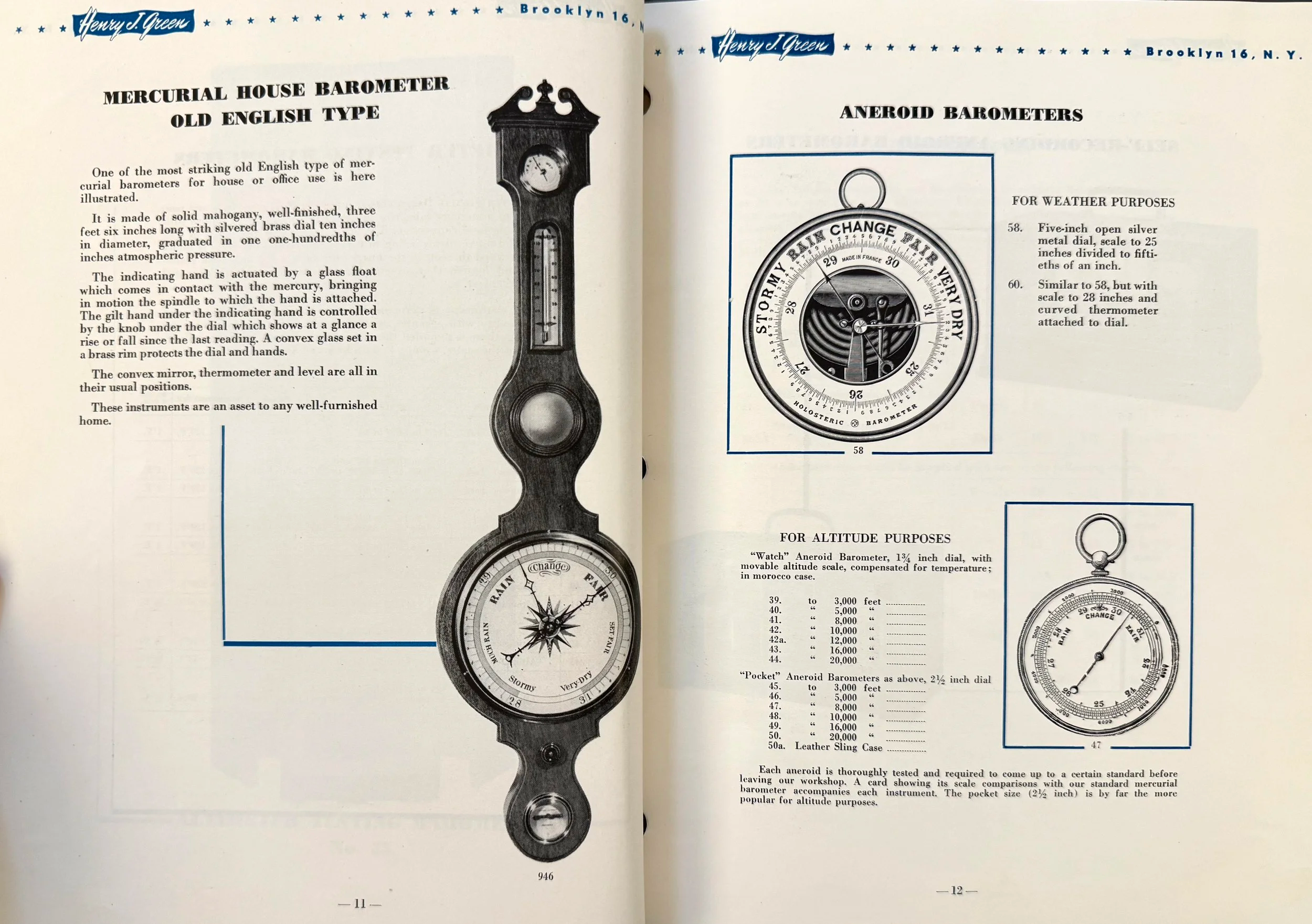 In our archival collection, we hold the papers of the Henry J. Green Company, manufacturer of meteorological and scientific instruments. James Green and his nephew Henry J. Green were important barometer makers and sold to institutions like the U. S. Navy and the U. S. Weather Bureau. A generous relative donated the company’s papers to HSNY a couple of years ago.