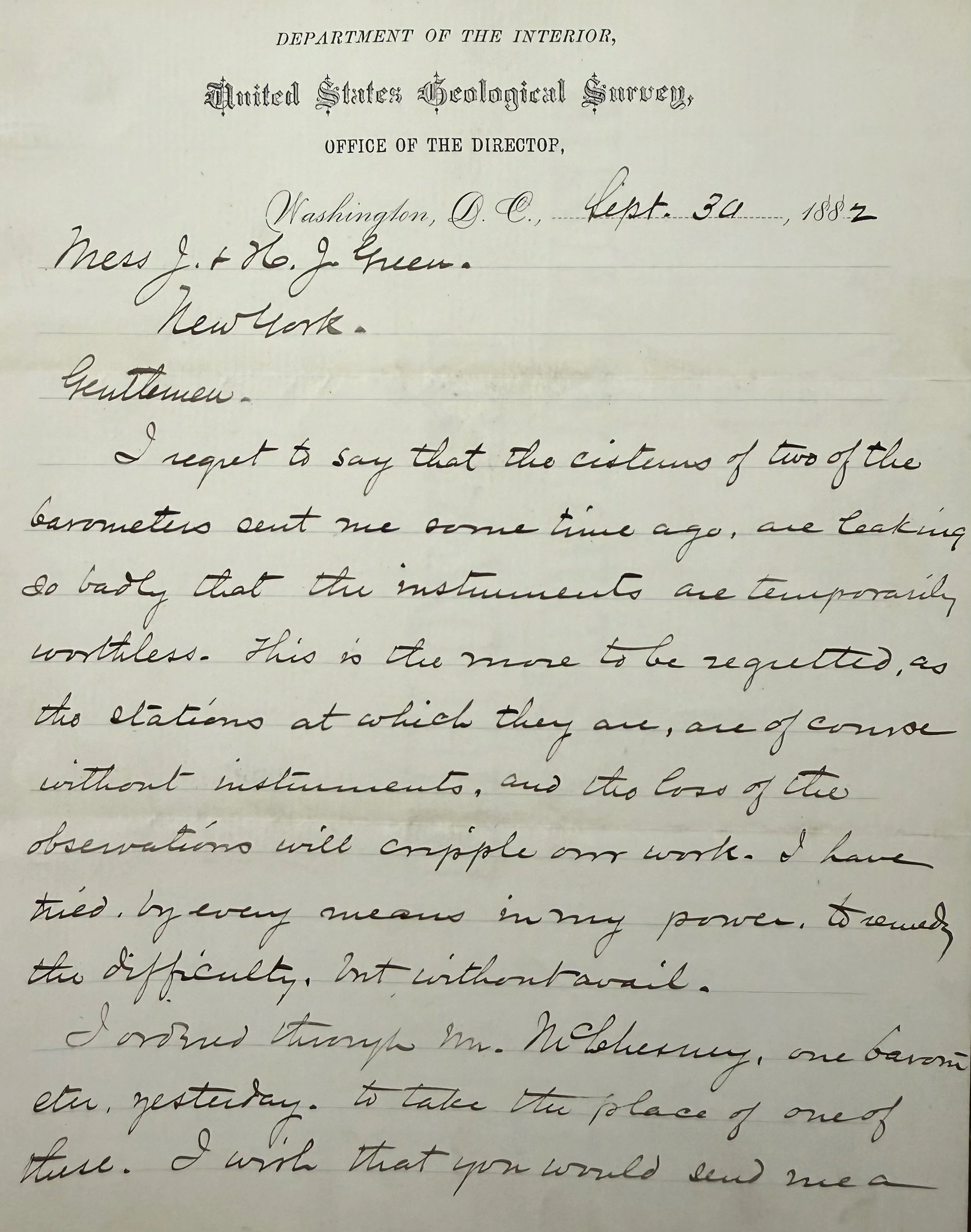Many of the letters in the collection are all obliging, full of praise for Green’s instruments. However, like any business, there were unhappy customers. In image 6, the Chief Geographer from the U.S. Geological Survey writes to Green: “I regret to say that the cisterns of two of the barometers sent me some time ago, are leaking so badly that the instruments are temporarily worthless…the loss of the observations will cripple our work.” He requests a new barometer “at once” and ends his letter “Hereafter I must beg you that you put your instruments in such order that difficulties of this kind will not arise as they cause very serious trouble.” I don’t know how this particular situation resolved.