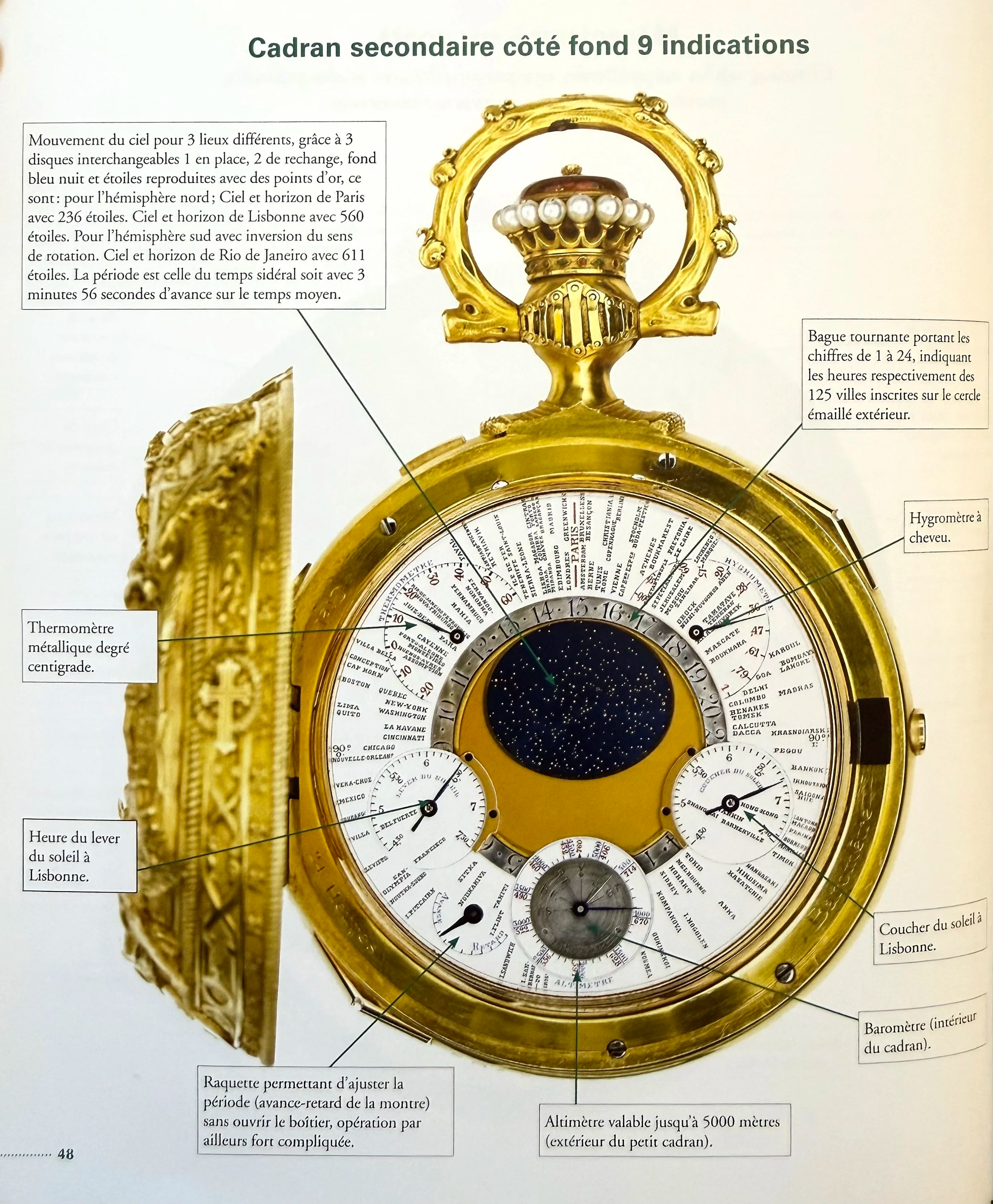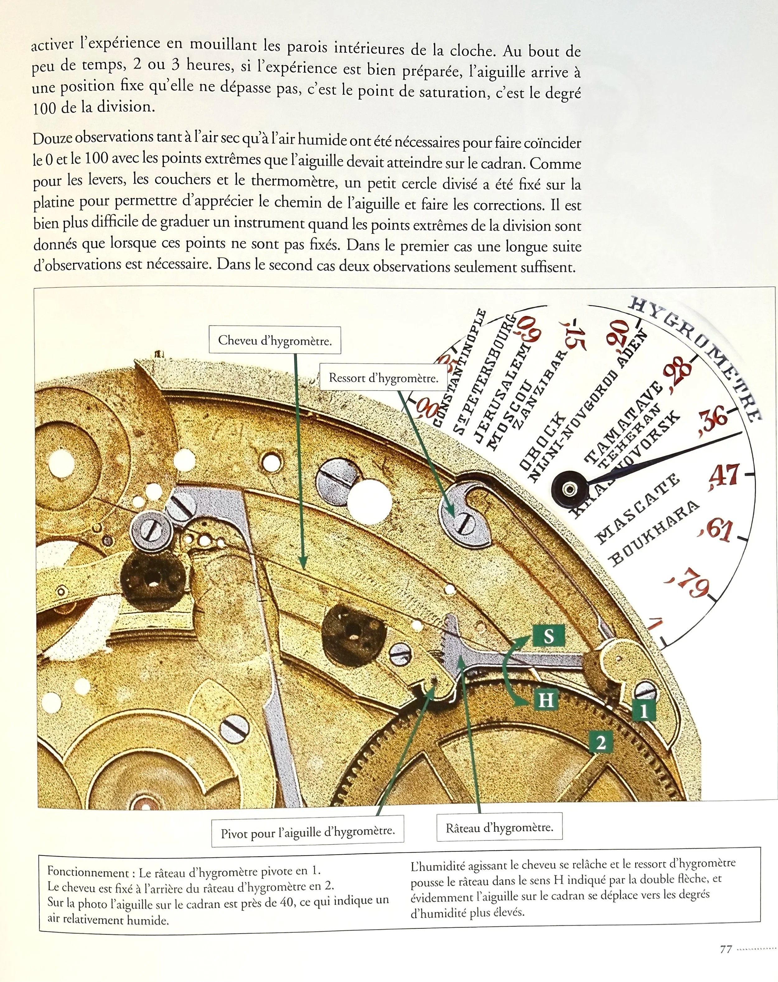 Above, images from one book in our library, “La Leroy 01, Ultra Compliquée,” in French, show a secondary dial on the famed watch with nine indications (of the 25), including hygrometer, barometer, and thermometer. Image 1 shows the dial, and image 2 explains how the hygrometer works inside the movement.