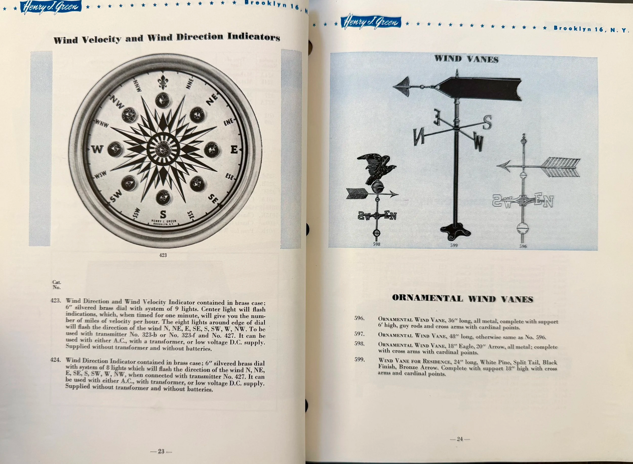 By the 1950s, H. J. Green was manufacturing barographs, rain and snow gauges, anemometers, wind vanes, thermographs, hygrometers, evaporimeters, and psychrometers (no, none of those are made up). Did you know there was so much to quantify about weather? A midcentury catalog (image 7) shows two types of barometers, a mercurial barometer (contains mercury, obviously) and an aneroid barometer (one that doesn’t use any liquid inside). Another page shows wind velocity and direction indicators, including ornamental wind vanes at right (image 8). We might not think of weather vanes as scientific instruments, but they do report data about atmospheric conditions, namely, which way the wind is blowing.