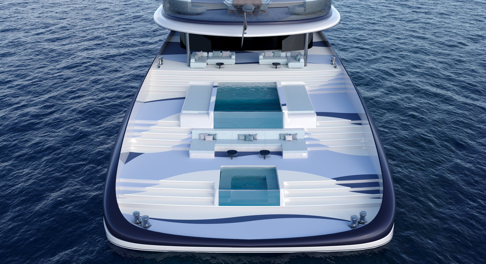 “Oceanco gave us the freedom to explore this idea,” Daroca says. Note, for instance, the colors and shapes of the decking flanking the aft-deck pool. Bolidt allows designers to request particular patterns, colors, and even structures. They can draw from a maritime influence, somewhat like the blues in this superyacht concept, or other elements of Mother Nature. Additionally, they can draw inspiration from art or architecture. This therefore allows for more variations and more creativity than wood. As Robert van Aarle, director maritime & defense of Bolidt, says, “Designers bring the vision, owners bring their dreams, and we provide the expertise to translate them into material and application.”