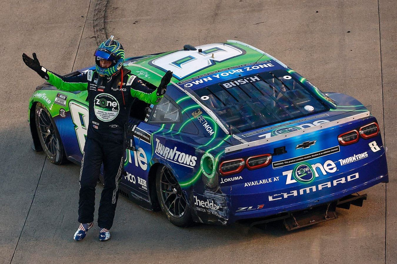 Kyle Busch, driver of the #8 zone/Thorntons Chevrolet, exits his car and reacts after an on-track incident during the NASCAR Cup Series Ally 400 at Nashville Superspeedway on June 30, 2024 in Lebanon, Tennessee. (Photo by Sean Gardner/Getty Images)