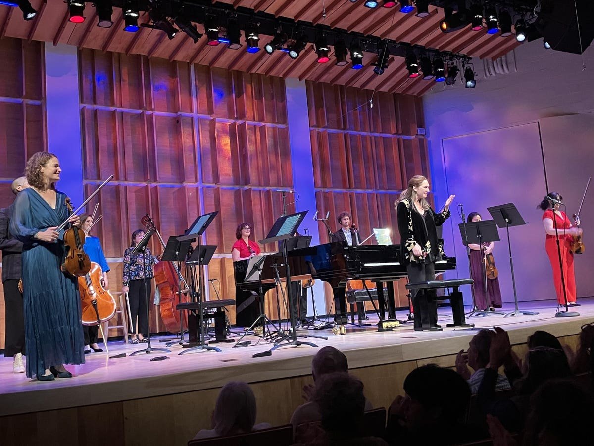 Simone Dinnerstein and Baroklyn with Jennifer Johnson Cano (standing fourth from the left, stage left) and Katherine Needleman (standing second from the left, stage left) at Kaufman Music Center’s Merkin Hall in New York City on Oct. 21, 2025.