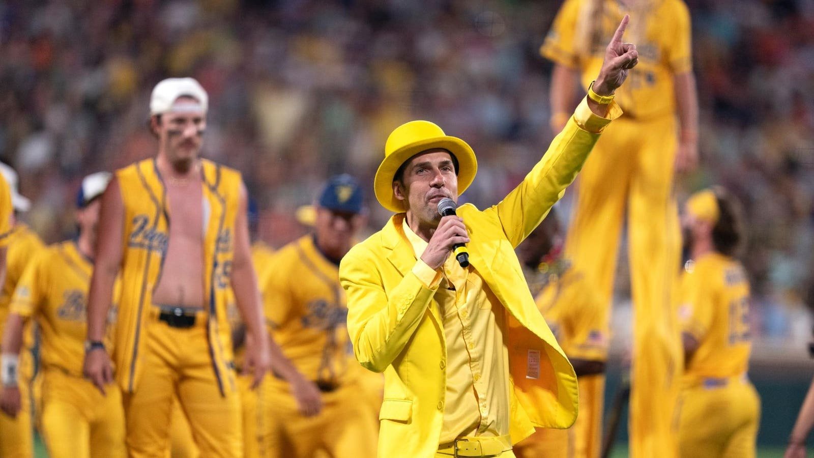 Dressed in his signature yellow tuxedo and top hat, Cole calls to Split—the team’s mascot, a towering banana—to approach with a yellow suitcase and removes a single banana to hand to a 3-year-old girl named Ellie. The tension builds in the sold-out stands as she takes a bite and chews before, finally, she yells, “Good!” The stadium erupts, and white smoke shoots up from the dugouts as Kool & The Gang’s “Celebration” blasts over the loudspeakers.